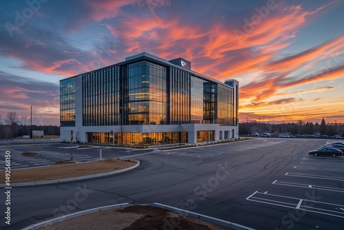 Modern Business Complex with Striking Sunset and Vacant Parking Area