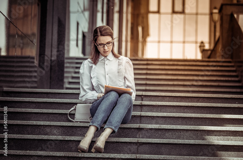 note, portrait, financial, street, beautiful woman, young, lady, casual attire, stair, office, write, businesswoman, woman, business, document, sitting, consulting, people, person, caucasian, folder, female, city, modern, city life, paperwork, urban, planning, notepad, paper, job, entrepreneur, professional, holding, reading, attractive, finance, idea, working