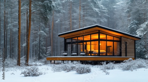 cabin, snowy, forest, winter, modern, house, light, warm, glasses, wood, structure, exterior, landscape, nature, snow, tree, design, architecture, illuminated, cosy, peaceful, calm, building, illumination, simple, contemporary, interior, rustic, beauty, scenery, elegant, minimalist