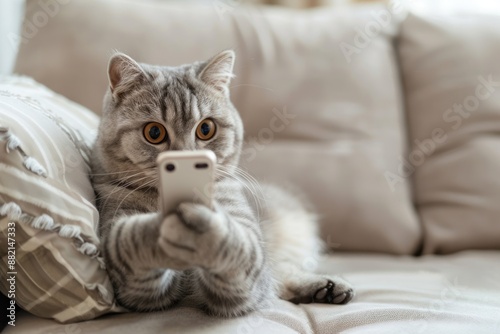 Modern cat playing holding smartphone sitting on a sofa at home, Funny animals