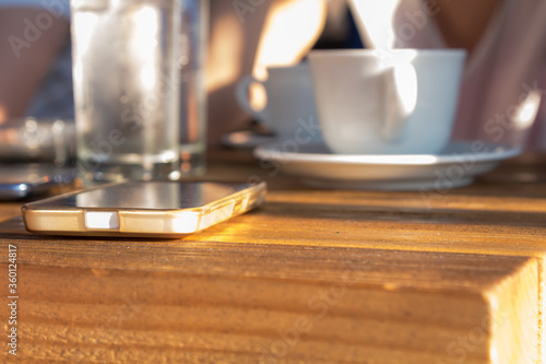 Modern cellphone on a coffee shop table with blurred people in the background.