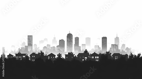 Modern City Skyline Silhouette in Black and White. A Stunning Digital Art Illustration with Minimalist Architecture Featuring High-Rise Buildings and Trees in a Foggy Urban Landscape