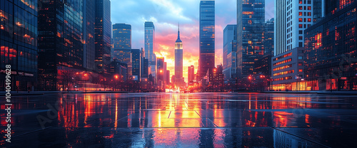 Modern city street with skyscrapers. Dawn. High detail.
