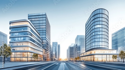 skyscraper, city, building, architecture, urban, modern, metropolis, downtown, glasses, window, concrete, steel, design, city landscape, structure, tower, business, commercial, real estate, development, skyline, horizon, street, road, dawn, sunrise, morning, light, blue, grey, contemporary, elegant, sophisticated, futuristic, city landscape, city view, perspective, fisheye, clean, line, minimal
