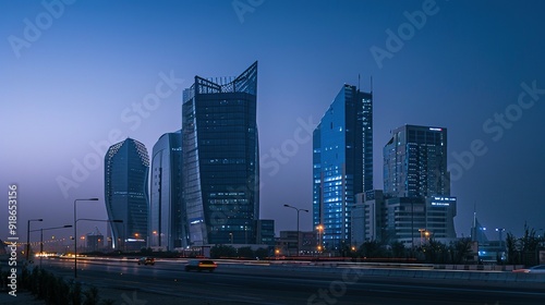 city, skyline, skyscraper, building, night, dusk, twilight, urban, modern, architecture, glasses, steel, concrete, light, street, road, traffic, car, headlamp, blur, motion, street light, street light, city landscape, horizon, sky, dark, blue, illuminated, metropolis, downtown, tied-up, development, growth, advancement, progress, construction, infrastructure
