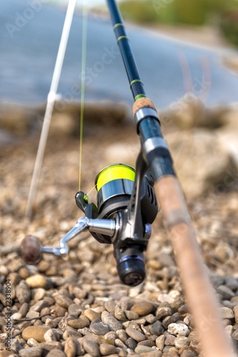 fishing, rod, gear, line, duck pond, leisure, spring, river, wood texture, holiday, summer, spin, equipment, wood, rest, tench, spiral, relax, reel, hobby, water, nature, fish, vacation, fisherman, sport, coil, metal, catch, relaxation, clean, new, ground, lake, stone, sky