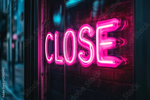 Modern "CLOSE" sign in glowing neon lights, vibrant pink, blue, and purple, mounted on dark wall, urban aesthetic