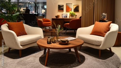 interior, design, furniture, living, room, seating, chair, sofa, hot drink, table, wooden, modern, home, decor, lounge, minimalist, contemporary, cosy, comfortable, accent, pillow, orange, beige, cream, light, warm, texture, rug, plant, art, display, space, stylish, aesthetic, luxury