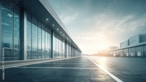 Modern Commercial Building Exterior with Glass Facade and Open Space at Sunset
