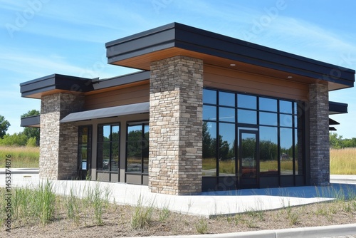 Modern Commercial Building Exterior with Stone Accents and Large Windows on a Sunny Day