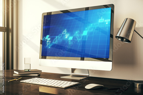 Modern computer monitor with abstract creative financial chart, research and strategy concept. 3D Rendering