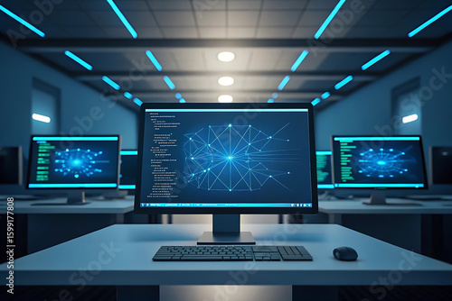 computer, technology, datum, network, server, room, datacenter, information, digital, blue, glowing, modern, futuristic, programming, coding, software, hardware, information technology, tech, analysis, system, connection, circuitry, abstract, display, screen, workspace, office, monitoring
