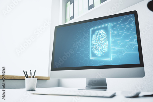 Modern computer screen with creative fingerprint hologram, personal biometric data concept. 3D Rendering