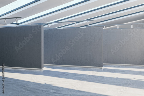 Modern concrete exhibition hall interior with empty mock up place on wall and sunlight. 3D Rendering.
