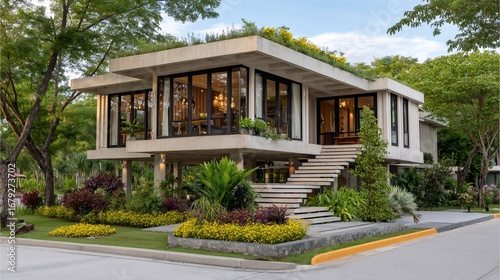 house, modern, architecture, concrete, building, exterior, design, home, contemporary, structure, residential, facades, green, roof, plant, landscaping, garden, tree, nature, grass, flower, yellow, sunlight, daylight, window, glasses, black, frame, staircase, step, paseo, suppressing, road, street, property, real estate, luxury, minimalist, urban, suburban, environment, environmentally friendly, sustainable, sky, blue, view, perspective, detail, style