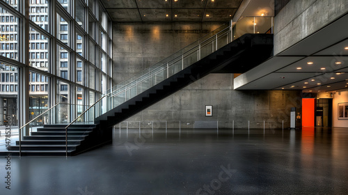 modern architecture, staircase, concrete, interior design, minimalist, empty space, industrial design, contemporary, city landscape, interior view, grey, black, geometric, steel, modern building, light, open space, urban scene, interior, dark