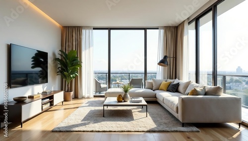 Modern condo living room with stylish furniture and large windows, showcasing natural light and minimalist design , apartment, stylish