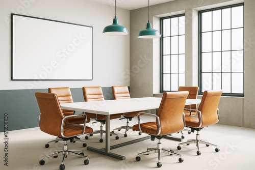 Modern conference room interior with brown leather chairs, white table, large windows and blank frame on wall in bright contemporary office space.