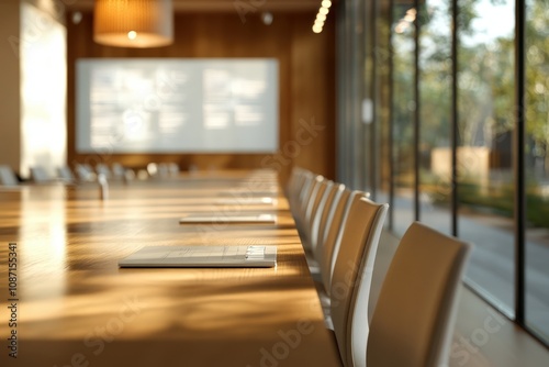 Modern Conference Room with Large Table and Natural Light, Empty Chairs Waiting for Participants, Warm Wooden Interior and Inviting Atmosphere
