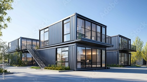 building, architecture, modern, design, container, home, office, structure, contemporary, steel, metal, glasses, window, door, facades, exterior, residential, commercial, innovative, sustainable, eco, friendly, efficient, stylish, aesthetic, sleek, minimalist, industrial, urban, complex, property, real, estate, space, room, level, balcony, stair, landscaping, plant, tree, sky, sunlight, day
