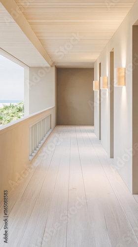 Modern corridor design featuring natural light and minimalist decor in a coastal setting