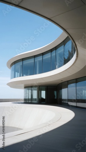 Modern Curved Building with Glass Facade and Reflective Surfaces