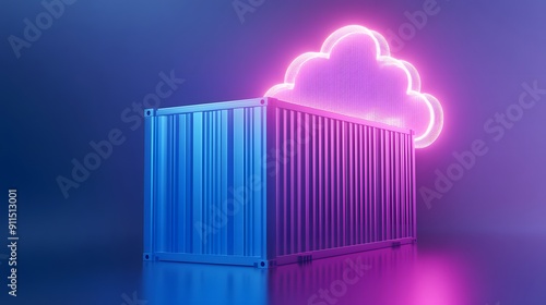 Modern digital concept of cloud computing with a shipping container and neon cloud symbol on a reflective surface.