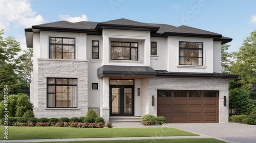house, home, architecture, real estate, exterior, building, residential, modern, contemporary, property, luxury, facades, suburban, design, style, new construction, landscape, lawn, front yard, window, door, garage, stone, white, black, trim, homeowner, investment, mortgage, affluent, upscale, neighbourhood, community, housing, residence, estate, homeownership, beautiful, elegant, roomy, lifestyle, outdoors