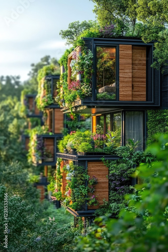 Modern eco-friendly urban complexes, modular smart houses with solar panels and greenery on the houses.
