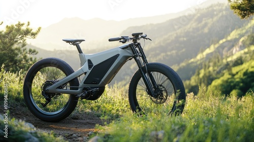 Modern Electric Mountain Bike on Trail in Scenic Mountain Landscape During Golden Hour with Vibrant Greenery and Natural Backdrop