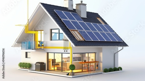 Modern energy-efficient house with solar panels on the roof, contemporary architecture, and sustainable design features.