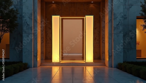 entrance, doorway, illuminated, modern, design, architecture, marble, night, lighting, exterior, building, contemporary, landscape, urban, structure, wall, symmetry, plant, outdoors, entranceway, stylish, sleek, minimal, light, shadow, pathway, facades, tile, antechamber, welcoming, clean, vertical, polished, elegant, lighted, square, geometric, night scene, soft light, inviting, ambience, luxury, modern architecture