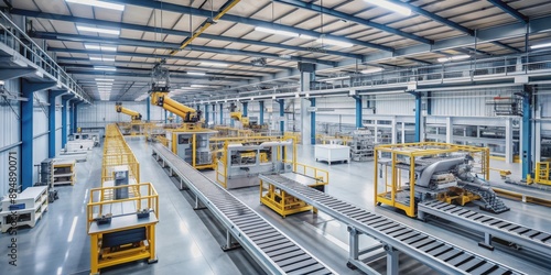 Modern factory with robotic machinery and conveyor belts, manufacturing, industry, production line
