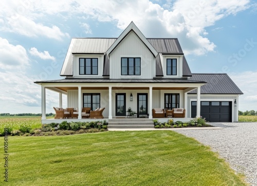 farmhouse, modern, home, house, exterior, architecture, design, white, siding, black, roof, window, porch, front, door, lawn, landscaping, grass, sky, cloud, rural, country, suburban, american, real estate, residential, property, home decor, home improvement, new home, contemporary, style, aesthetic, lawncare