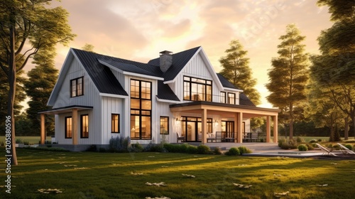 house, home, farmhouse, modern, architecture, design, residential, building, sunset, evening, landscape, tree, grass, lawn, yard, sky, cloud, window, door, roof, metal, wood, porch, patio, deck, pool, luxury, contemporary, elegant, roomy, comfortable, style, aesthetic, exterior, view, property, nature, serene, tranquil, beauty, light, shadow