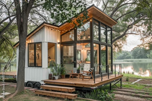 modern, farmhouse, tiny, house, loft, mezzanine, tranquil, lake, retreat, natural, light, wooden, porch, rustic, charme, elegance, white, facades, string, light, potted, plant, cosy, chair, greenery, serene, setting, sustainable, living, architectural, design, home, decor, interior, nature, relaxation, get-away, compact, unique, architecture, peaceful, lakeshore, scenic, view, minimalist, craftsmanship, activity, small