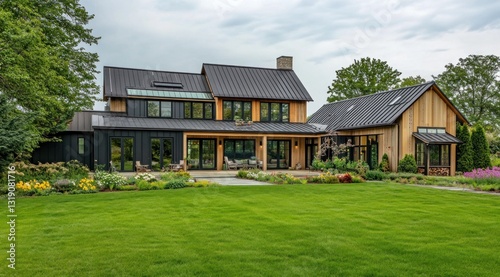 house, home, farm, farmhouse, modern, architecture, building, design, exterior, residential, property, real estate, landscaping, lawn, garden, yard, grass, tree, sky, cloud, window, door, siding, roof, metal, wood, black, grey, green, spring, summer, luxury, elegant, roomy, comfortable, family, dream, lifestyle, rural, suburban, contemporary, style, estate
