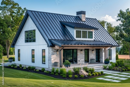 Modern farmhouse with metal roof, concept updated rustic, copy space, modern theme, futuristic, Manipulation, metal roof backdrop