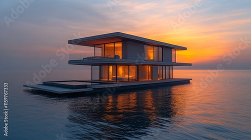 house, floating, modern, sunset, water, calm, ocean, sea, architecture, design, contemporary, luxury, villa, home, residence, waterfront, tranquil, peaceful, serene, evening, dusk, sky, cloud, reflections, glasses, window, minimalist, style, building, structure, 2, story, level, balcony, pool, dock, property, estate, sunrise, gloaming, horizon, twilight