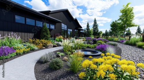 modern architecture, pathway, water feature, flowering plant, perennial, shrub, tree, backyard, garden design, landscaping, summer, daytime, sunlit, calm, serene, peaceful, tranquil, relaxing, natural, greenery, flower, yellow flower, purple flower, colorful flowers, exterior, building exterior, property, real estate, landscape architecture, digital rendering, visualisation, garden