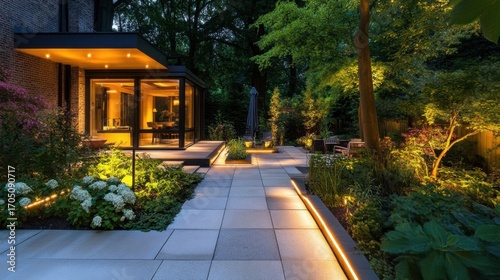 modern, garden, illuminated, pathway, architecture, night, contemporary, lighting, design, landscaping, tree, house, glasses, window, nature, plant, patio, evening, ambience, backyard, environment, stylish, exterior, shrub, foliage, greenery, relaxation, peaceful, serene, luxury, residence, home, calmness, paved, paseo, floral, decoration, glow, structure, yard