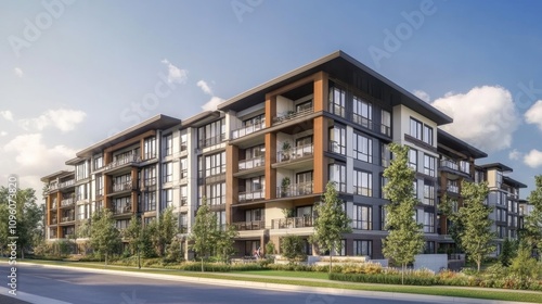 apartment, building, modern, geometric, perspective, design, architecture, exterior, residential, urban, landscape, nature, sky, sunlight, tree, balcony, contemporary, facades, housing, development, green, symmetry, line, city, space, environment, structure, view, community, layout, style, urbanism, construction, quality, aesthetic, warm, inviting, neighbourhood, environmentally friendly, serenity, innovation, relaxation, beauty, detail