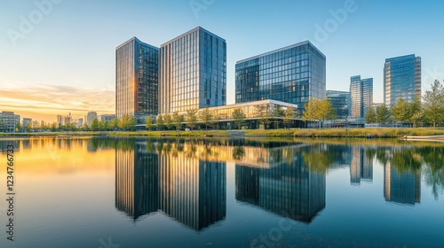 Modern Glass Buildings Reflected in a Calm Lake at Sunset