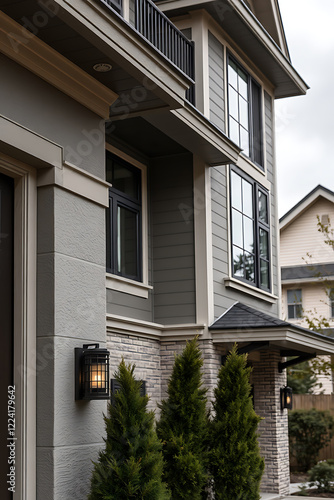 Modern Gray House Exterior: Contemporary Home Design and Architecture. Luxury Real Estate Property with Elegant Facade and Landscaping