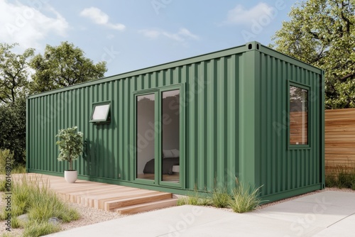 Modern Green Container Home with Outdoor Deck and Natural Surroundings