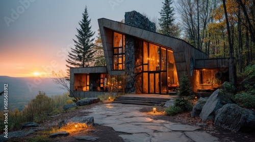 Modern hillside house with large glass windows at sunset, surrounded by trees, featuring angular architecture,