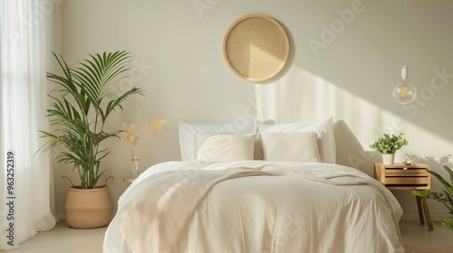 bedchamber, interior, modern, room, indoor, home, house, nobody, bed, bedding, pillow, clean, neat, lifestyle, comfortable, luxury, furniture, pillow, decoration, decor, apartment, plant, circle, mirror, sunlight, breezy, nordic, interior design