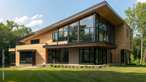 modern home exterior crafted from eco-friendly materials like reclaimed wood, recycled steel, and energy-efficient glass