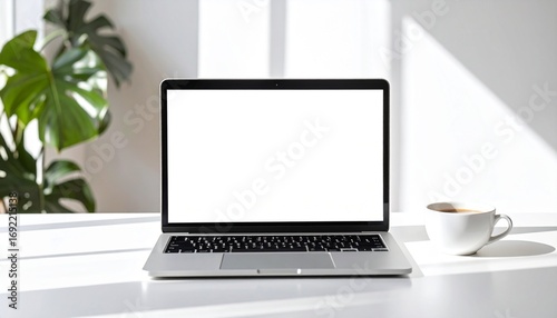 Modern home office workspace with a laptop featuring a blank screen for mockup, alongside a coffee cup and plant in morning sunlight