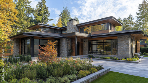 modern, home, stone, facades, large, window, greenery, tree, garden, architecture, contemporary, luxury, residential, exterior, design, landscape, sky, building, house, suburban, elegant, stylish, nature, environment, peaceful, roomy, driveway, autumn, foliage
